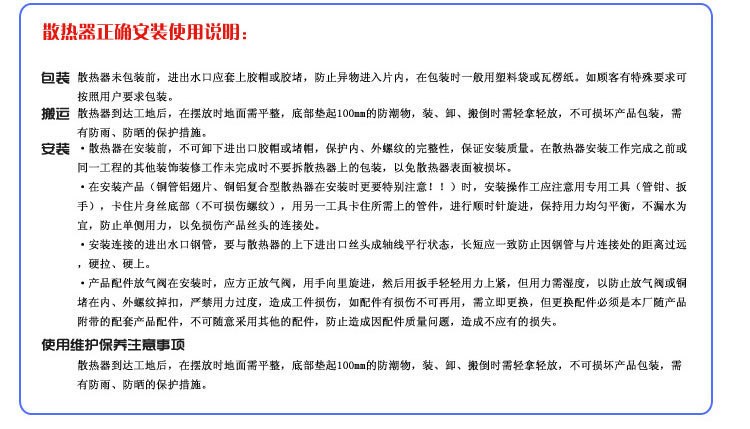 钢五柱散热器由于材质本身的特点而散热,铝合金耐酸和抗氧化,但是生碱性腐蚀;钢具有高强度和碱性,但会被氧化和腐蚀。钢制五支柱散热器产品也是散热器生产中百分比相对较大的钢制散热器产品,一般使用静电轧制,内部防腐蚀处理,在用到散热器时具有防腐蚀机能。