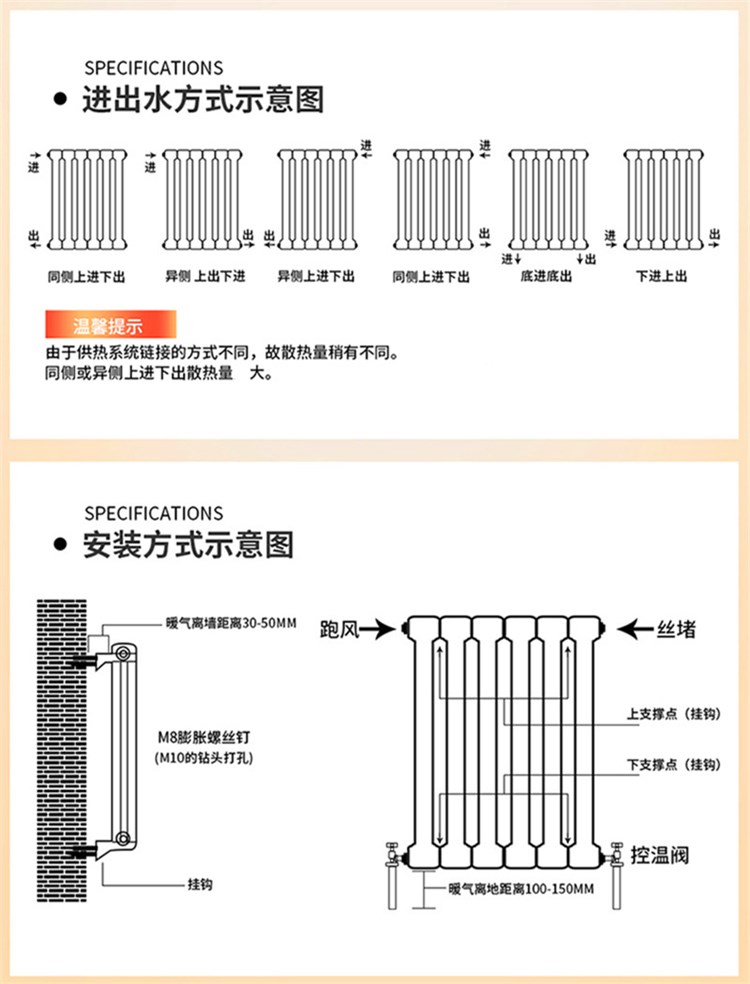 钢五柱散热器体积小,形状简便,外形美观,设备方便。流态管状构造,加工焊接工艺,钢制五柱散热器散热,承压能力强。补充运输。需要充分的水保护。加热管与外部氧气接触会被氧化。同时,可以在加热设备外部采用加热盖开展保护。加热时间更长。因此,还需要不时清洁散热器。维持表面清洁和不规范。大修时,检查阀门和管道连接是不是松动。