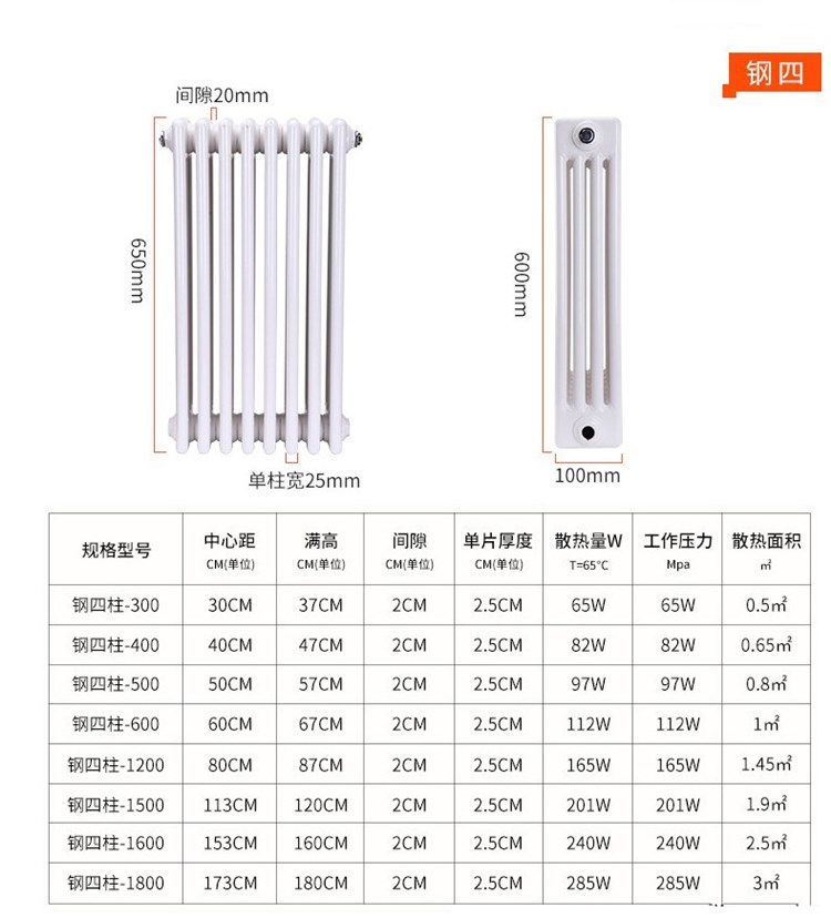 钢四柱散热器,是钢制散热器的一种规格,一般用于散热器工程用户,其钢制四柱散热器取代了本来的老式铸铁散热器,在美观,散热等方面都有所改善它比其他新型散热器低廉得多。钢制四柱样式与钢制三柱样式相像,只是增加了一根支柱。适用于:一些大型,中型和小型公共建筑物,办公楼和平常住宅,例如学校,诊所,工厂,图书馆,宿舍楼,浴室,旅店,商贸办公楼等,也可以出口到国外,很远在埃及,埃尔及利亚等地方出售使用柱散热器的地方。