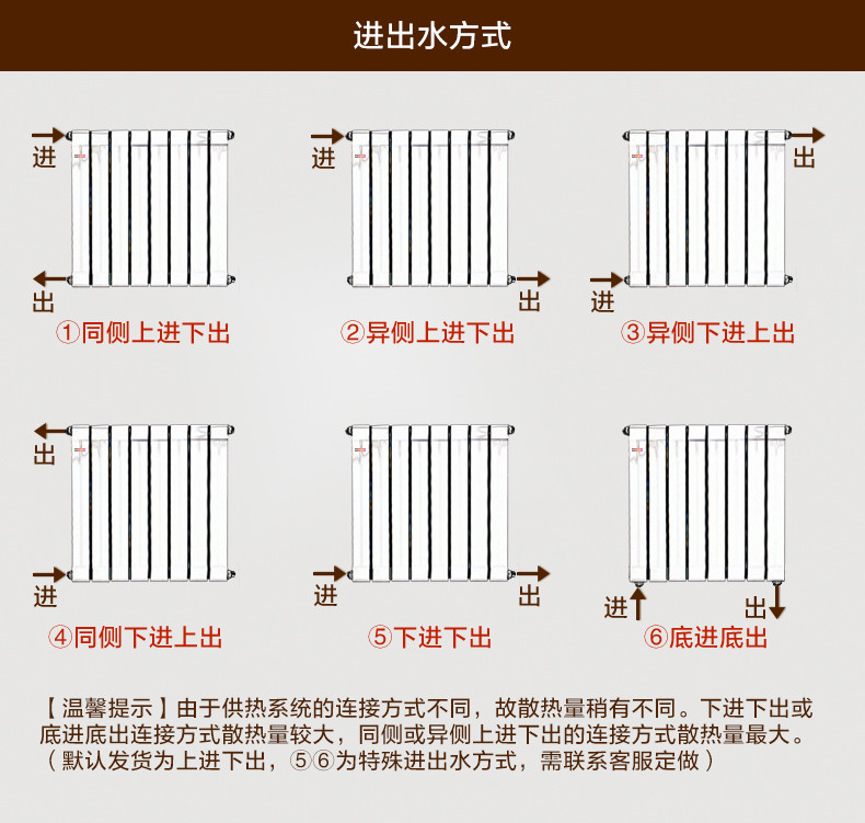 安装散热器设备时,请细心检验包装中散热器的种类,色调和配件,附件包括1个塞子,1个排气阀,3个支架,须要将进水阀和出水阀安装在散热器的安装方式。不用为了省钱而忽视这些过程。在安装管道时,应根据本书中的安装图改动散热器的安装方式。