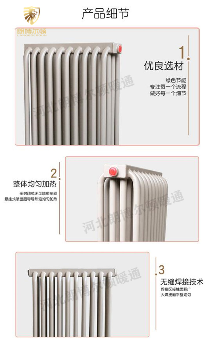 钢制弧管四柱散热器的厚度超过2.5mm低碳钢管,使用熔焊工艺制造,使用寿命长,耐高压,并在外部喷涂静电粉末,其优点是构造新颖,构造连贯,构造连贯。合理,散热方法的优点是互补的,功能获取了充分利用,具有重量轻,外观雅致时尚,设备维护便捷的特性。